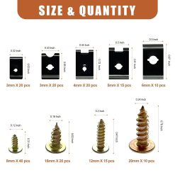 Specifications: 4 popular sizes screw( 40pcs 3*8mm, 20pcs 4*16mm, 15pcs 5*12mm, 10pcs 6*20mm) and 5 popluar sizes U-clip(20pcs 3mm, 20pcs 4mm, 20pcs, 4mm15pcs 5mm, 10pcs 6mm)